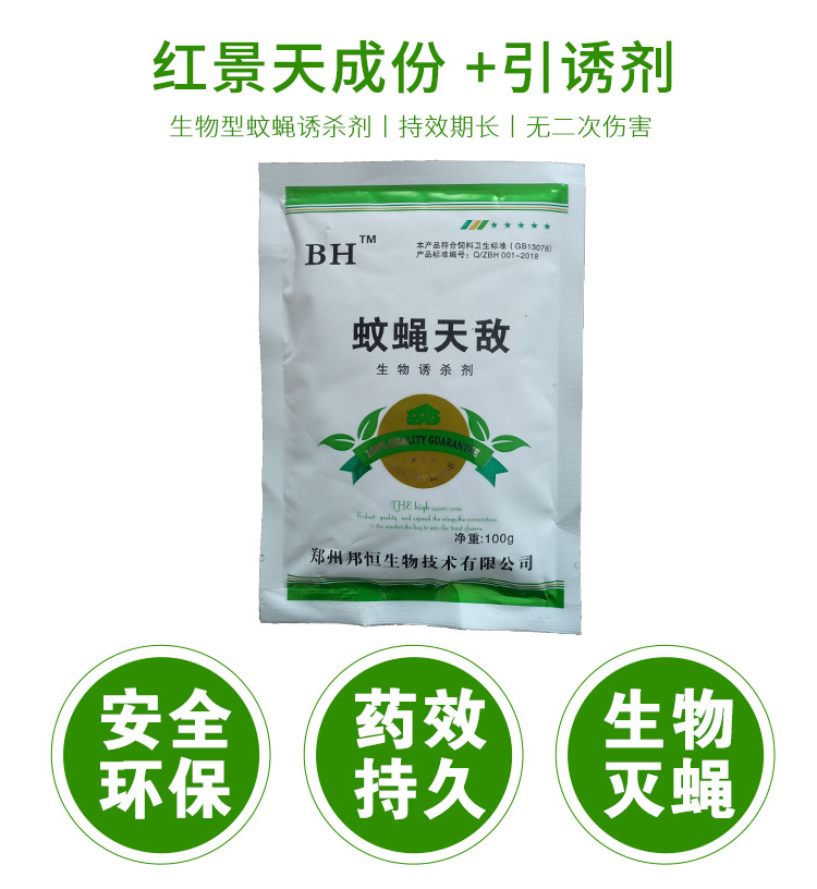其次可以使用有效的杀虫剂来消灭蚊蝇,郑州邦恒生物的蚊蝇天敌采用世界卫生组织推荐的低毒卫生杀虫剂。是一款安全的生物诱杀剂,无毒无副作用,在养殖圈舍可放心使用,对人和动物无二次伤害,成本低,一袋能够干撒百十平米或者兑水10斤喷洒,15元一包。